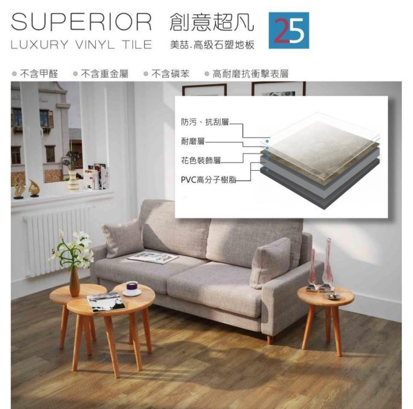 ●免上膠 ●鎖扣式組裝簡單 ●環保可重複利用 ●不含甲醛及重金屬 ●高耐磨抗衝擊表層 6*36*2.5mm(24片/包/坪) 7.25* 48*2.5mm(15片/包/坪) ※依據不同型號有不同規格尺寸